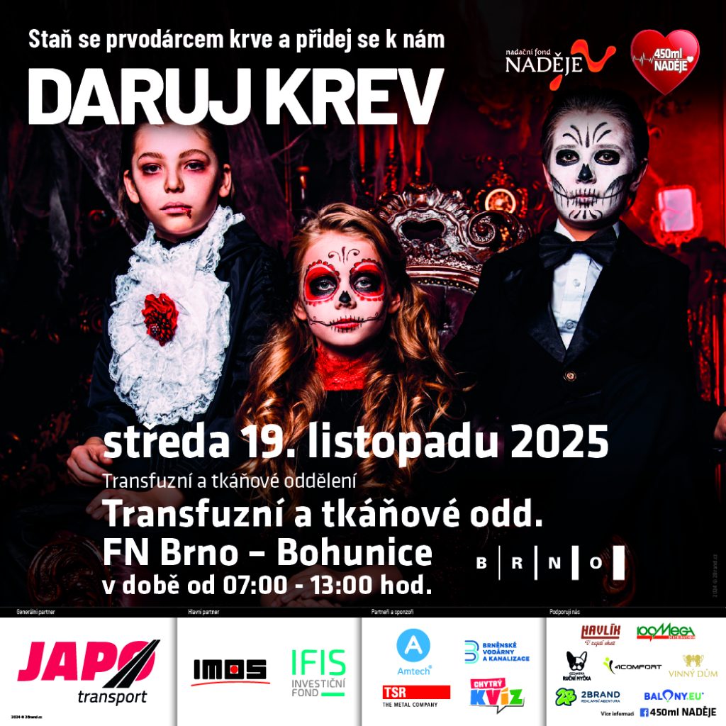 Teď je ta šance! Ve středu 19. listopadu 2025 se na Transfuzním a tkáňovém oddělení FN Brno – Bohunice koná další ročník dárcovské akce 450 ml naděje, kterou náš fond s hrdostí podporuje.